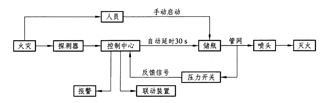 氣體滅火系統(tǒng)的工作原理是:防護(hù)區(qū)一旦發(fā)生火災(zāi),首先火災(zāi)探測器報(bào)警,消防控制中心接到火災(zāi)信號(hào)后,啟動(dòng)聯(lián)動(dòng)裝置(關(guān)閉通風(fēng)口、停止空調(diào)等),延時(shí)約30s后,打開啟動(dòng)氣瓶的瓶頭閥,利用氣瓶中的高壓氮?dú)鈱缁饎﹥?chǔ)存容器上的容器閥打開,滅火劑經(jīng)管道輸送到噴頭噴出實(shí)施滅火。這中間的延時(shí)是考慮防護(hù)區(qū)內(nèi)人員的疏散。另外,通過壓力開關(guān)監(jiān)測系統(tǒng)是否正常工作,若啟動(dòng)指令發(fā)出而壓力開關(guān)的信號(hào)遲遲不返回,說明系統(tǒng)故障,值班人員聽到事故報(bào)警,應(yīng)盡快到儲(chǔ)瓶間,手動(dòng)開啟儲(chǔ)存容器上的容器閥,實(shí)施人工啟動(dòng)滅火。氣體滅火系統(tǒng)滅火過程框圖如圖所示。