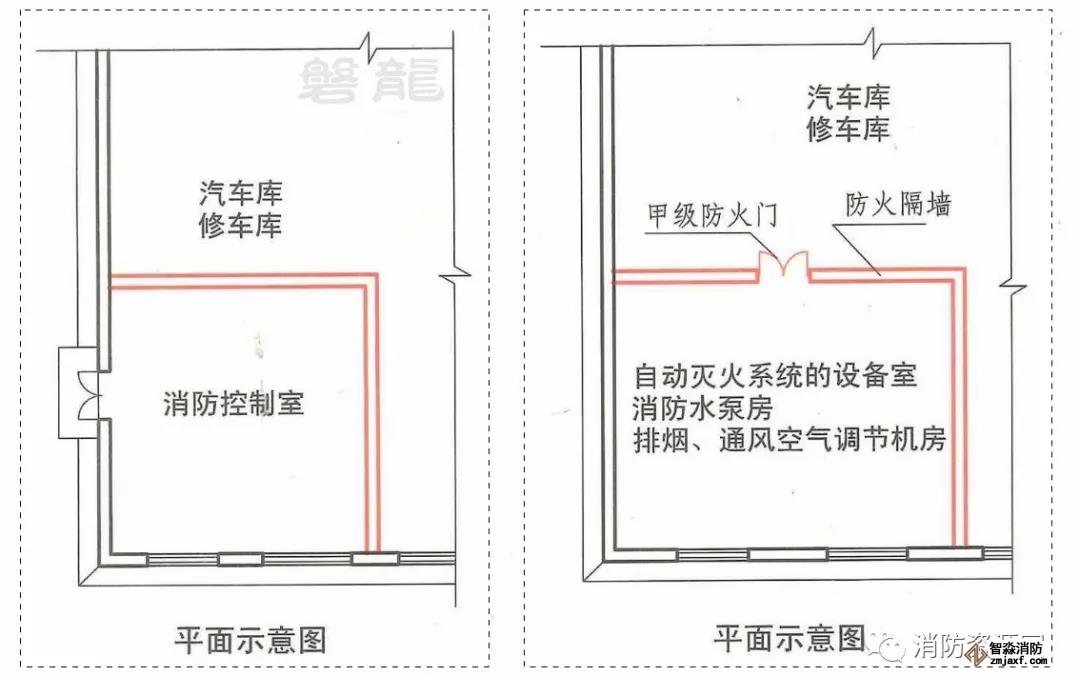 三、附設(shè)在汽車庫、修車庫內(nèi),且主要為其服務(wù)的消防控制室、自動(dòng)滅火系統(tǒng)的設(shè)備室、消防水泵房和排煙、通風(fēng)空氣調(diào)節(jié)機(jī)房等,應(yīng)采用防火隔墻和耐火極限不低于1.50h的不燃性樓板相互隔開或與相鄰部位分隔,部分設(shè)備室的疏散門可以向汽車庫或修車庫開啟,詳見圖示1。