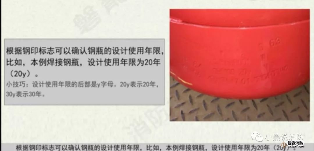 根據(jù)規(guī)程中表3-5,氣體滅火系統(tǒng)的儲氣瓶有無縫鋼瓶和焊接鋼瓶,使用年限分別為30年和20年,而這些數(shù)據(jù)根據(jù)該規(guī)程要求在出廠時應(yīng)作為永久性標(biāo)志刻在鋼瓶瓶身,仔細(xì)觀察,可以在瓶身上看到氣瓶的設(shè)計使用年限。